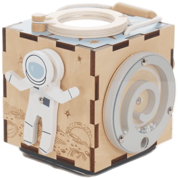 überall mit hingenommen werden - Ausgestattet mit einem Labyrinth, Zahnrädern, einem Spiegel und einem schwebenden Astronauten macht der tragbare Würfel jeden Ausflug zum Weltraumabenteuer